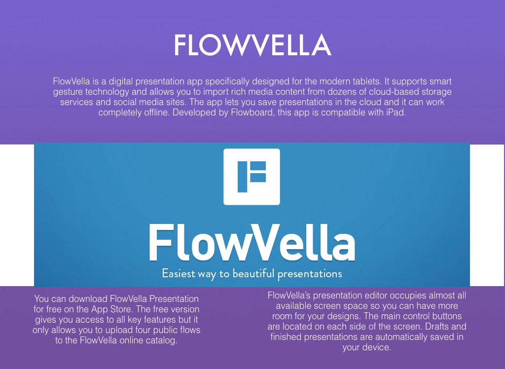 FlowVella is a digital presentation app specifically designed for the modern tablets. It supports smart gesture technology and allows you to import rich media content from dozens of cloud-based storage services and social media sites. The app lets you save presentations in the cloud and it can work completely offline. Developed by Flowboard, this app is compatible with iPad.