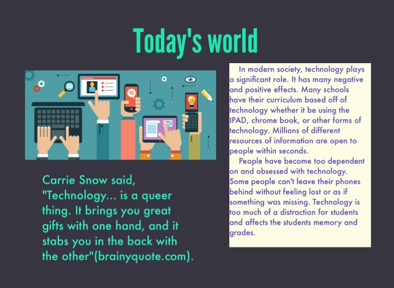 In modern society, technology plays a significant role. It has many negative and positive effects. Many schools have their curriculum based off of technology whether it be using the IPAD, chrome book, or other forms of technology. Millions of different resources of information are open to people within seconds.
