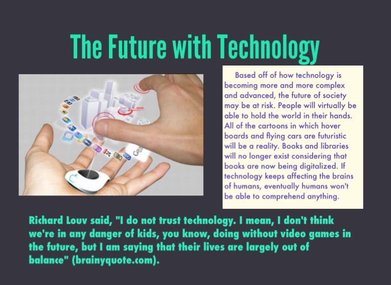 Based off of how technology is becoming more and more complex and advanced, the future of society may be at risk. People will virtually be able to hold the world in their hands. All of the cartoons in which hover boards and flying cars are futuristic will be a reality. Books and libraries will no longer exist considering that books are now being digitalized. If technology keeps affecting the brains of humans, eventually humans won't be able to comprehend anything.