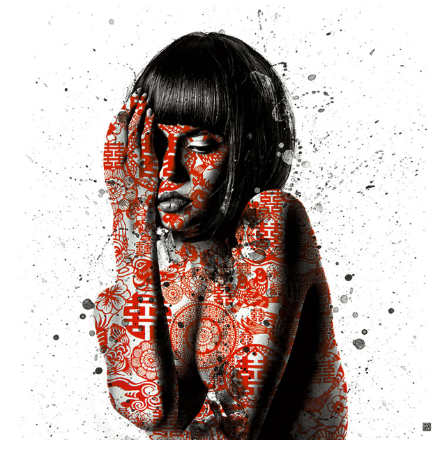 Beauty comes in many different forms and we should celebrate them all. This picture is beautiful because it shows aspects of western culture and asian culture. It shows a westernized photo in regards to the girl's hair, pose, nudity, and the splatter paint around the photo. However, the picture also incorporates a traditional asian pattern that makes the photo stunning. The artist is trying to convey the message that there is beauty in all cultures and we need to incorporate all the positive but leave behind the negatives to better ourselves as humans on this Earth. Too much of one thing is never good, but a healthy balance is always perfect.
