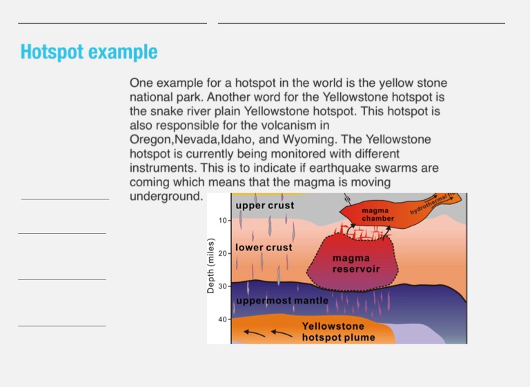 One example for a hotspot in the world is the yellow stone national park. Another word for the Yellowstone hotspot is the snake river plain Yellowstone hotspot. This hotspot is also responsible for the volcanism in Oregon,Nevada,Idaho, and Wyoming. The Yellowstone hotspot is currently being monitored with different instruments. This is to indicate if earthquake swarms are coming which means that the magma is moving underground.