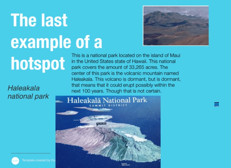 This is a national park located on the island of Maui in the United States state of Hawaii. This national park covers the amount of 33,265 acres. The center of this park is the volcanic mountain named Haleakala. This volcano is dormant, but is dormant, that means that it could erupt possibly within the next 100 years. Though that is not certain.
