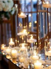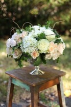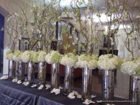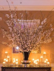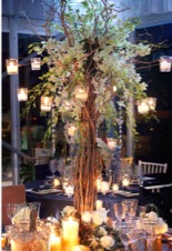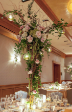 Personal flowers are to feel romantic and lavish. Neutral toned blooms such as ranunculus, garden roses, lisianthus, astilbe and dusty miller. The place card table will be the focus of the room with a 10 foot tall centerpiece of branches and flowers giving a luxurious first impression. While accents of floating globes and floating candles in cylinders will add ambiance to the room. Bridal party will sit at 2 long 8 foot tables flanked with tall curly willow arrangements with hydrangeas on the base and hanging stock and votive candles in petit lanterns. For guests tables two designs will give the room character yet collective ness. Using crystal vases and mercury glass materials will offer a rich feeling. Table design A will offer a low romantic style arrangement with branches flowing through out. Table design B will be similar to bridal party table on a slightly smaller scale to over cohesiveness. Please see sketch for more detail. Please be aware this page is to give depiction of design not color combinations.