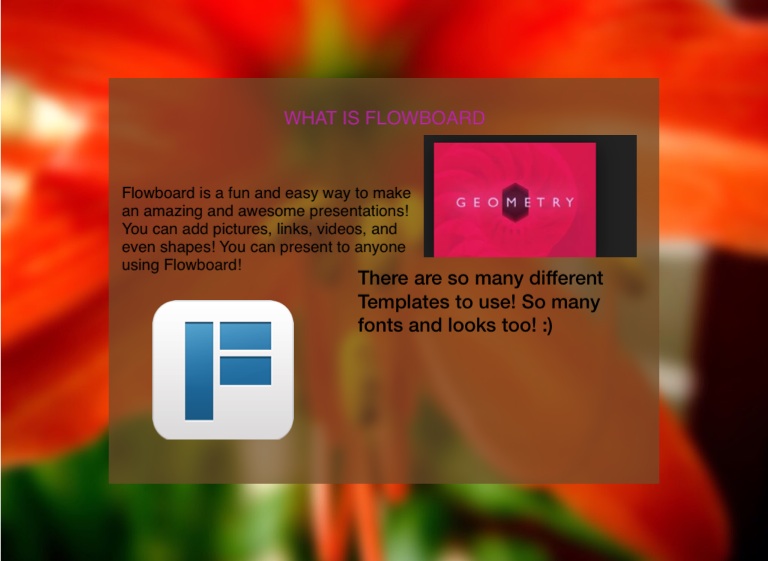 Flowboard is a fun and easy way to make an amazing and awesome presentations! You can add pictures, links, videos, and even shapes! You can present to anyone using Flowboard!