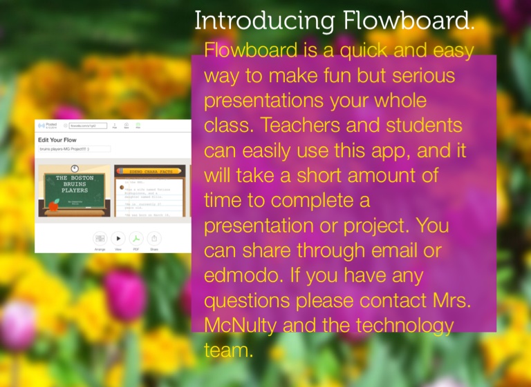 Flowboard is a quick and easy way to make fun but serious presentations your whole class. Teachers and students can easily use this app, and it will take a short amount of time to complete a presentation or project. You can share through email or edmodo. If you have any questions please contact Mrs. McNulty and the technology team.