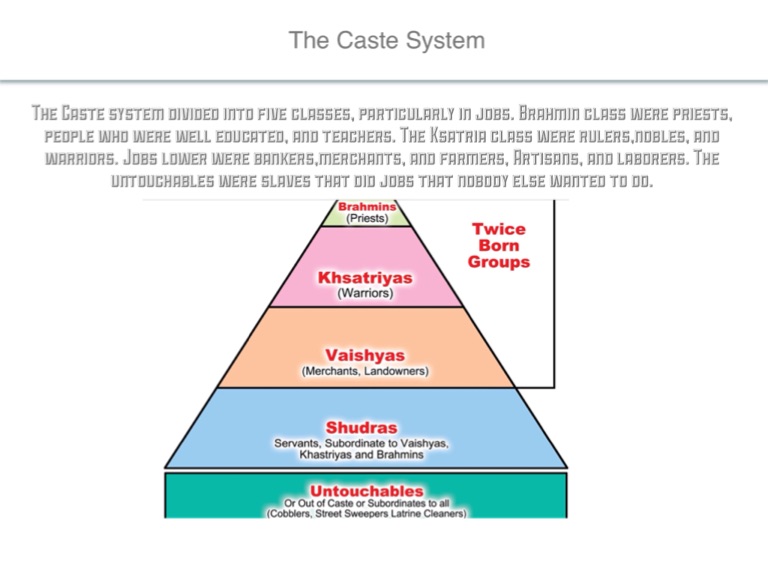 The Caste system divided into five classes, particularly in jobs. Brahmin class were priests, people who were well educated, and teachers. The Ksatria class were rulers,nobles, and warriors. Jobs lower were bankers,merchants, and farmers, Artisans, and laborers. The untouchables were slaves that did jobs that nobody else wanted to do.