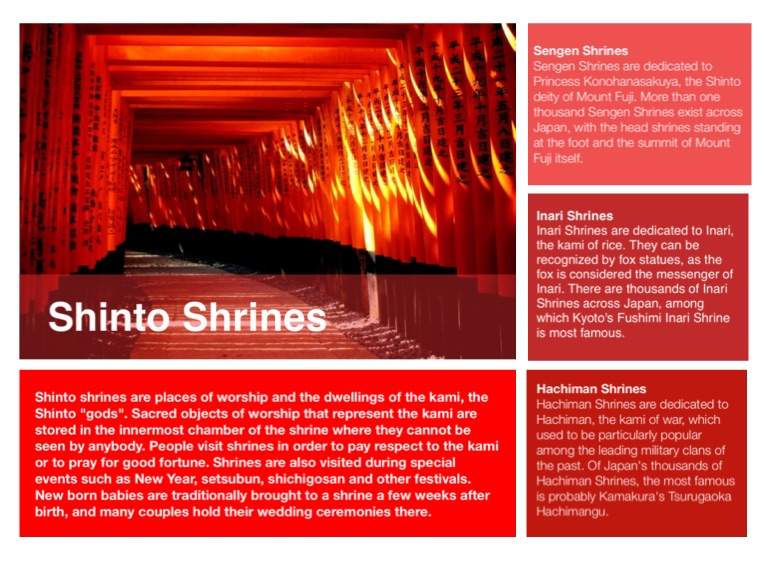 Shinto shrines are places of worship and the dwellings of the kami, the Shinto "gods". Sacred objects of worship that represent the kami are stored in the innermost chamber of the shrine where they cannot be seen by anybody. People visit shrines in order to pay respect to the kami or to pray for good fortune. Shrines are also visited during special events such as New Year, setsubun, shichigosan and other festivals. New born babies are traditionally brought to a shrine a few weeks after birth, and many couples hold their wedding ceremonies there.