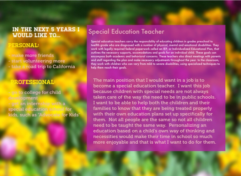 The main position that I would want in a job is to become a special education teacher. I want this job because children with special needs are not always taken care of the way the need to be in public schools. I want to be able to help both the children and their families to know that they are being treated properly with their own education plans set up specifically for them. Not all people are the same so not all children need to be taught the same way. Personalizing an education based on a child's own way of thinking and necessities would make their time in school so much more enjoyable and that is what I want to do for them.