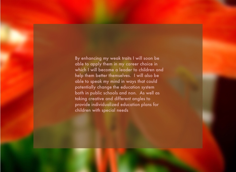 By enhancing my weak traits I will soon be able to apply them in my career choice in which I will become a leader to children and help them better themselves. I will also be able to speak my mind in ways that could potentially change the education system both in public schools and non. As well as taking creative and different angles to provide individualized education plans for children with special needs