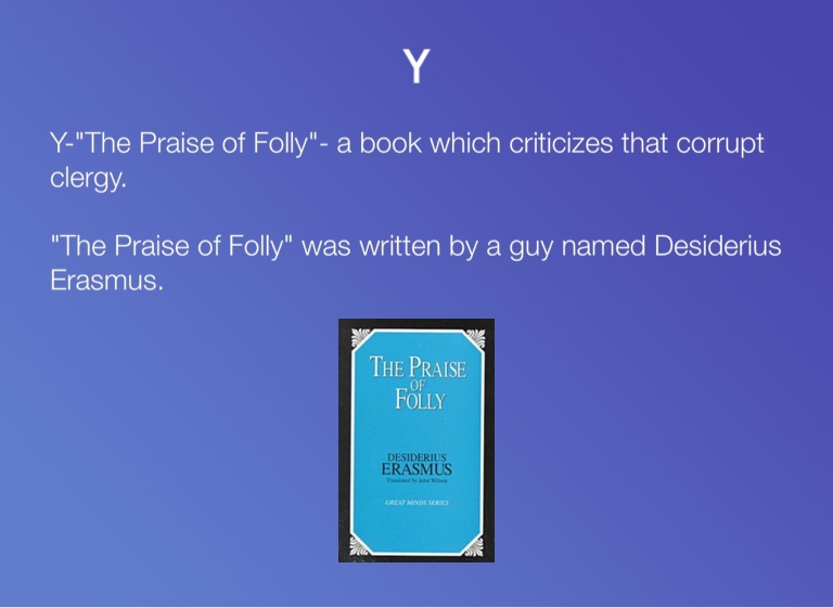 Y-"The Praise of Folly"- a book which criticizes that corrupt clergy.