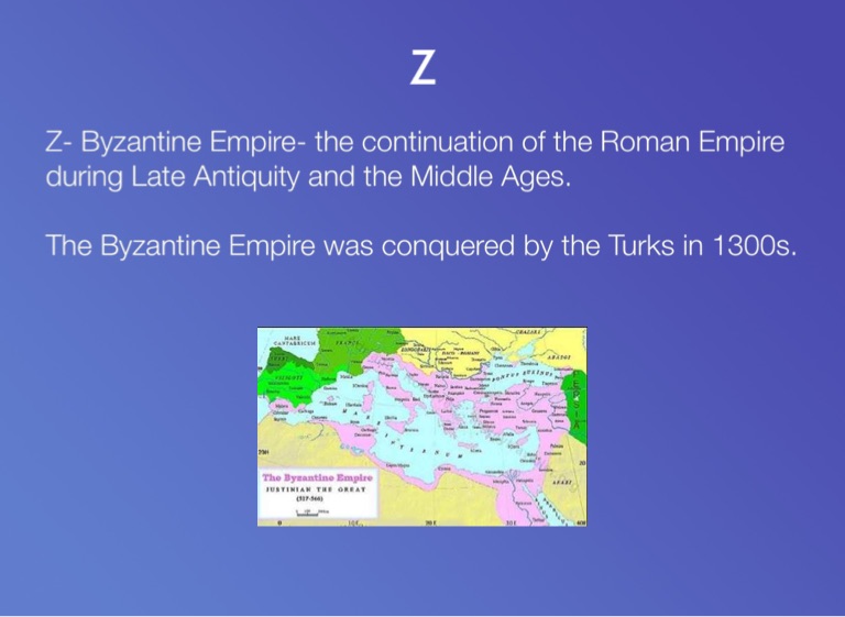 Z- Byzantine Empire- the continuation of the Roman Empire during Late Antiquity and the Middle Ages.