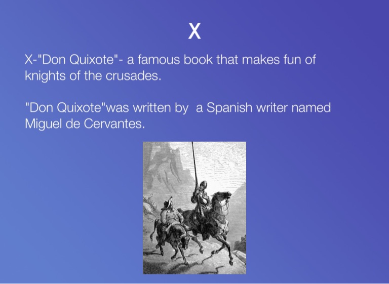 X-"Don Quixote"- a famous book that makes fun of knights of the crusades.