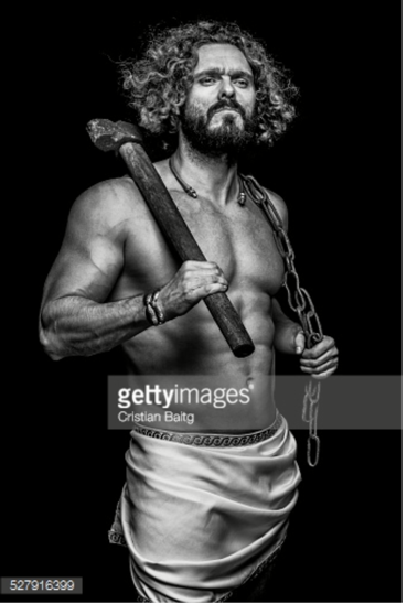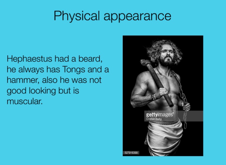 Hephaestus had a beard, he always has Tongs and a hammer, also he was not good looking but is muscular.