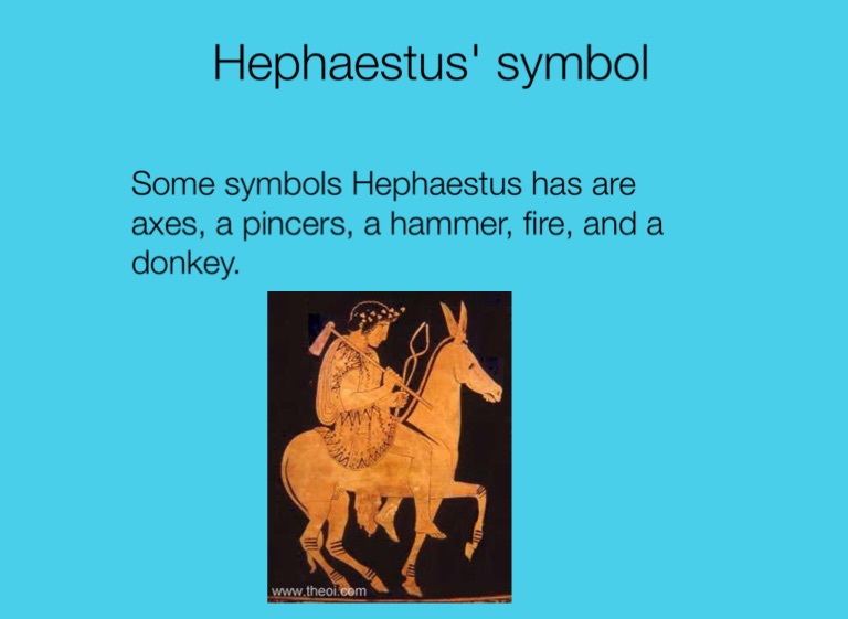 Some symbols Hephaestus has are axes, a pincers, a hammer, fire, and a donkey.