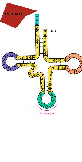 L' RNA di trasporto ( tRNA ) è un filamento che si ripiega a formare diversi lobi grazie ai legami ad idrogeno tra basi azotate dello stesso filamento.
