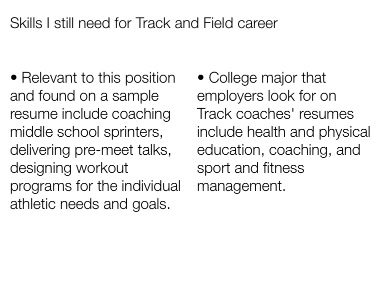 • College major that employers look for on Track coaches' resumes include health and physical education, coaching, and sport and fitness management.