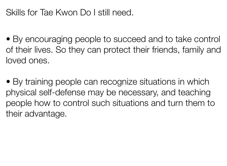 • By training people can recognize situations in which physical self-defense may be necessary, and teaching people how to control such situations and turn them to their advantage.