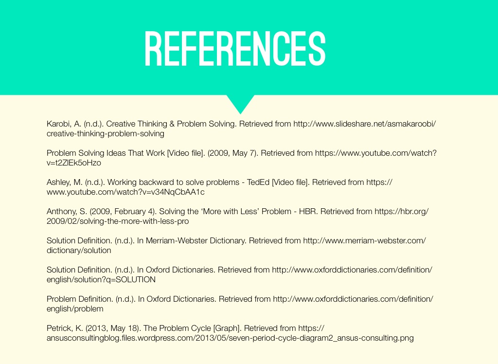 Karobi, A. (n.d.). Creative Thinking & Problem Solving. Retrieved from http://www.slideshare.net/asmakaroobi/creative-thinking-problem-solving