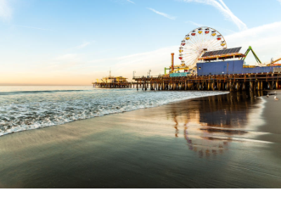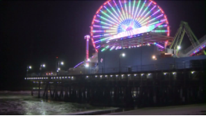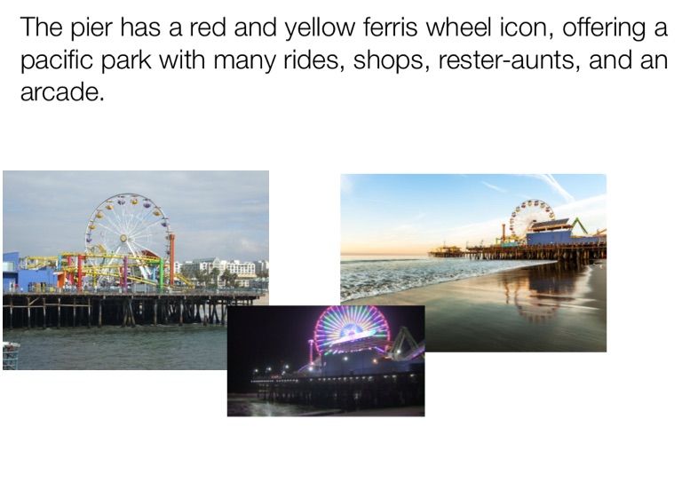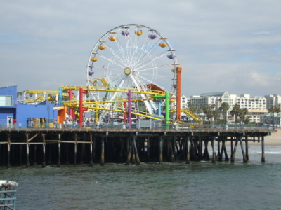 The pier has a red and yellow ferris wheel icon, offering a pacific park with many rides, shops, rester-aunts, and an arcade.