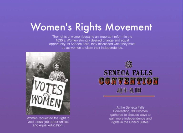 The rights of women became an important reform in the 1830's. Women strongly desired change and equal opportunity. At Seneca Falls, they discussed what they must do as women to claim their independence.