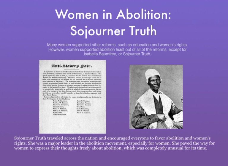 Many women supported other reforms, such as education and women's rights. However, women supported abolition least out of all of the reforms, except for Isabella Baumfree, or Sojourner Truth.