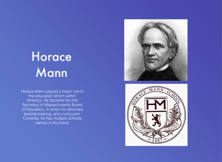 Horace Mann played a major role in the education reform within America. He became the first Secretary of Massachusetts Board of Education, in which he reformed teacher-training, and curriculum. Currently, he has multiple schools named in his honor.
