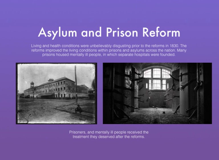 Living and health conditions were unbelievably disgusting prior to the reforms in 1830. The reforms improved the living conditions within prisons and asylums across the nation. Many prisons housed mentally ill people, in which separate hospitals were founded.