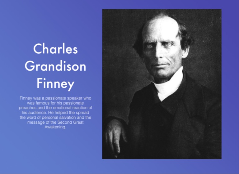 Finney was a passionate speaker who was famous for his passionate preaches and the emotional reaction of his audience. He helped the spread the word of personal salvation and the message of the Second Great Awakening.