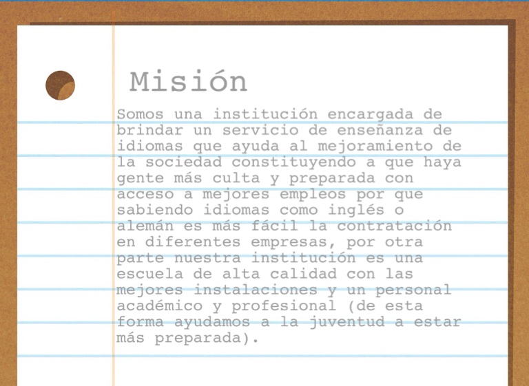 Somos una institución encargada de brindar un servicio de enseñanza de idiomas que ayuda al mejoramiento de la sociedad constituyendo a que haya gente más culta y preparada con acceso a mejores empleos por que sabiendo idiomas como inglés o alemán es más fácil la contratación en diferentes empresas, por otra parte nuestra institución es una escuela de alta calidad con las mejores instalaciones y un personal académico y profesional (de esta forma ayudamos a la juventud a estar más preparada).