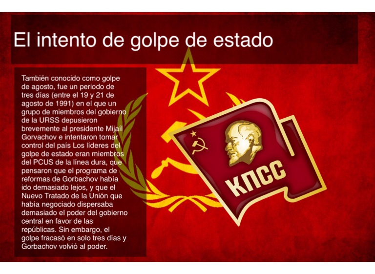 También conocido como golpe de agosto, fue un periodo de tres días (entre el 19 y 21 de agosto de 1991) en el que un grupo de miembros del gobierno de la URSS depusieron brevemente al presidente Mijaíl Gorvachov e intentaron tomar control del país Los líderes del golpe de estado eran miembros del PCUS de la línea dura, que pensaron que el programa de reformas de Gorbachov había ido demasiado lejos, y que el Nuevo Tratado de la Unión que había negociado dispersaba demasiado el poder del gobierno central en favor de las repúblicas. Sin embargo, el golpe fracasó en solo tres días y Gorbachov volvió al poder.