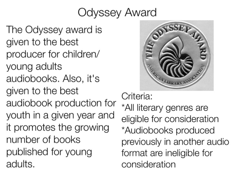 The Odyssey award is given to the best producer for children/young adults audiobooks. Also, it's given to the best audiobook production for youth in a given year and it promotes the growing number of books published for young adults.