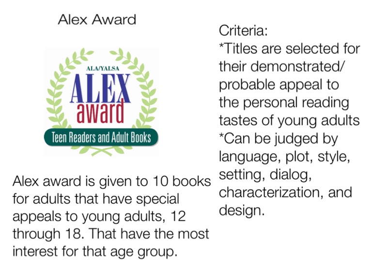 Alex award is given to 10 books for adults that have special appeals to young adults, 12 through 18. That have the most interest for that age group.