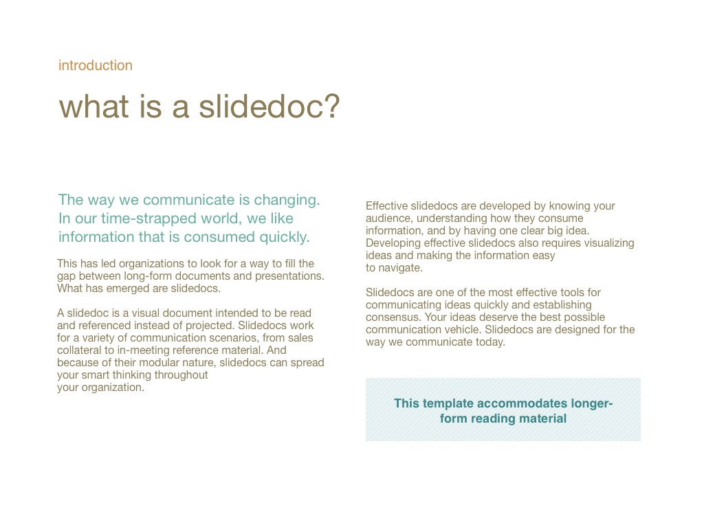 A slidedoc is a visual document intended to be read and referenced instead of projected. Slidedocs work for a variety of communication scenarios, from sales collateral to in-meeting reference material. And because of their modular nature, slidedocs can spread your smart thinking throughout