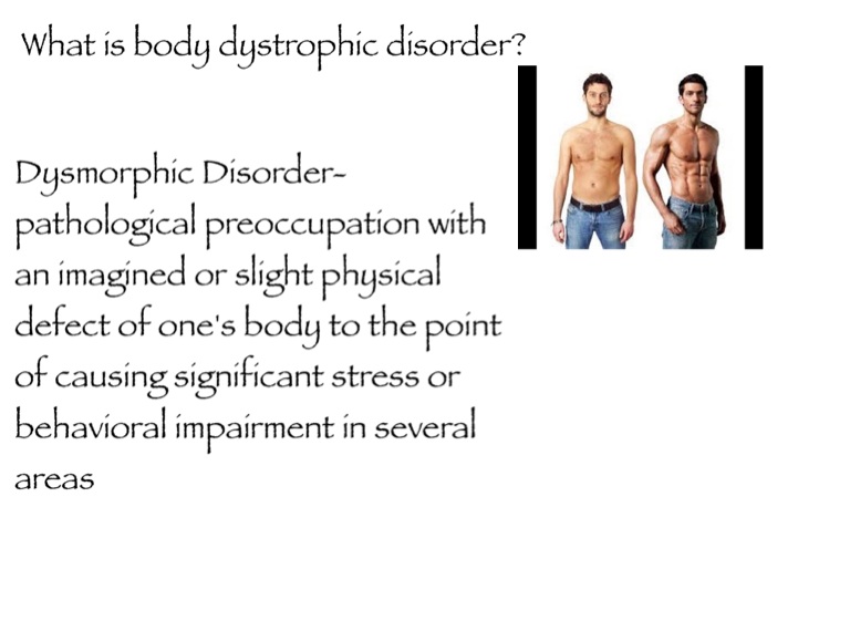 Dysmorphic Disorder-pathological preoccupation with an imagined or slight physical defect of one's body to the point of causing significant stress or behavioral impairment in several areas