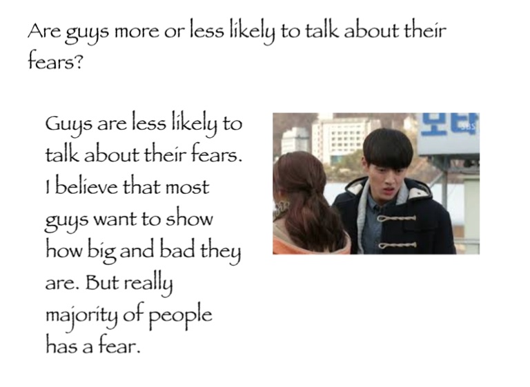 Guys are less likely to talk about their fears. I believe that most guys want to show how big and bad they are. But really majority of people has a fear.