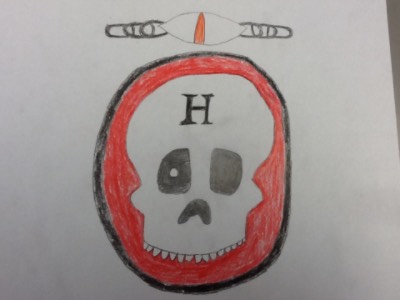 with a circle around it with an eye above with chains on each side. The skull also has an H on the forehead which stands for