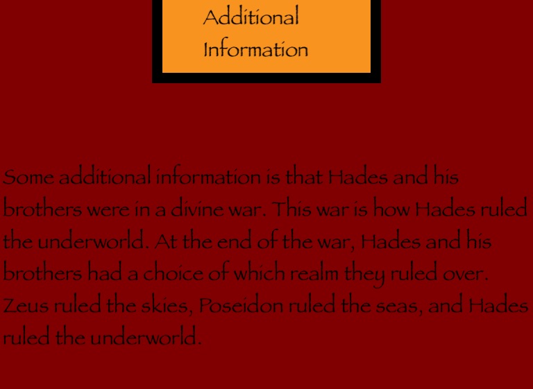 Some additional information is that Hades and his brothers were in a divine war. This war is how Hades ruled the underworld. At the end of the war, Hades and his brothers had a choice of which realm they ruled over. Zeus ruled the skies, Poseidon ruled the seas, and Hades ruled the underworld.