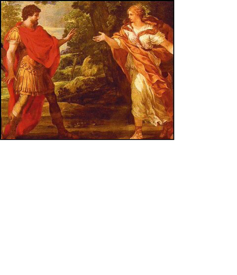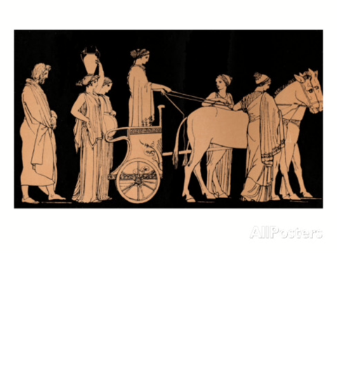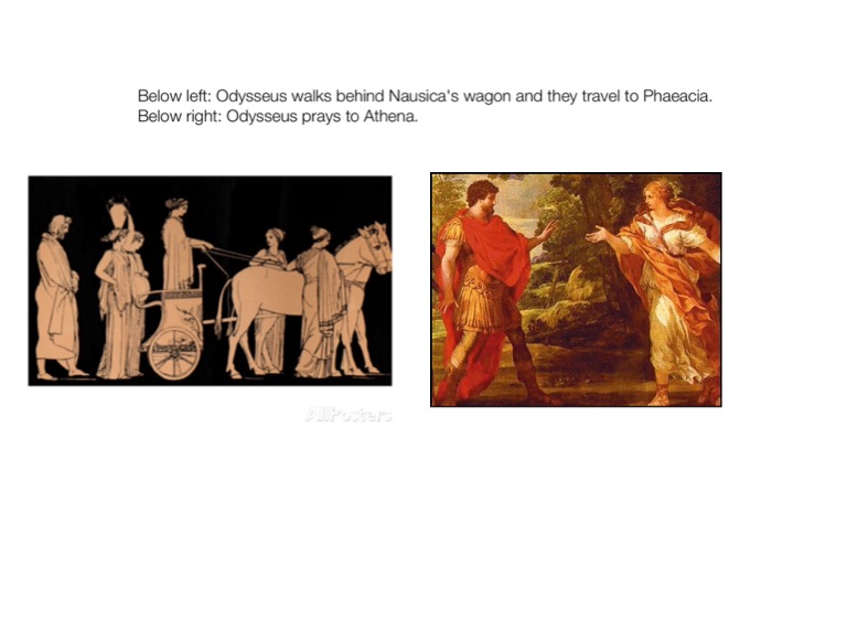 Below left: Odysseus walks behind Nausica's wagon and they travel to Phaeacia.