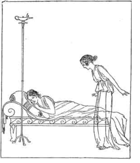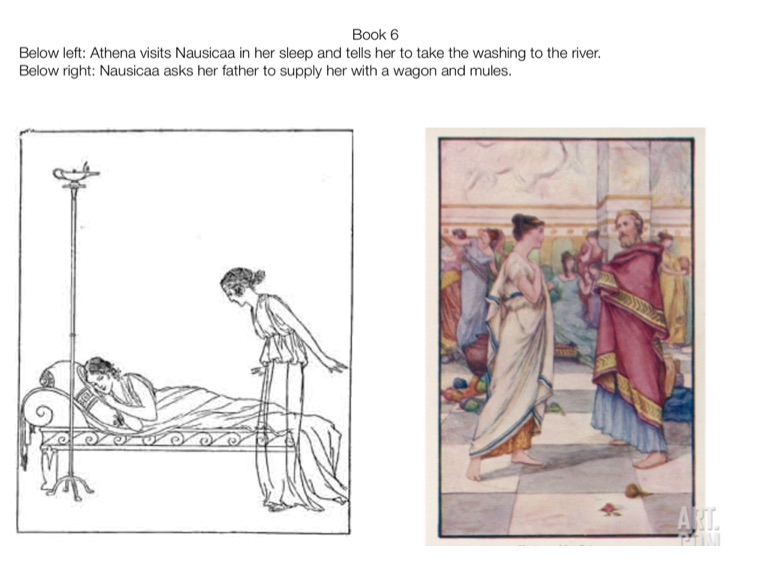 Below left: Athena visits Nausicaa in her sleep and tells her to take the washing to the river.
