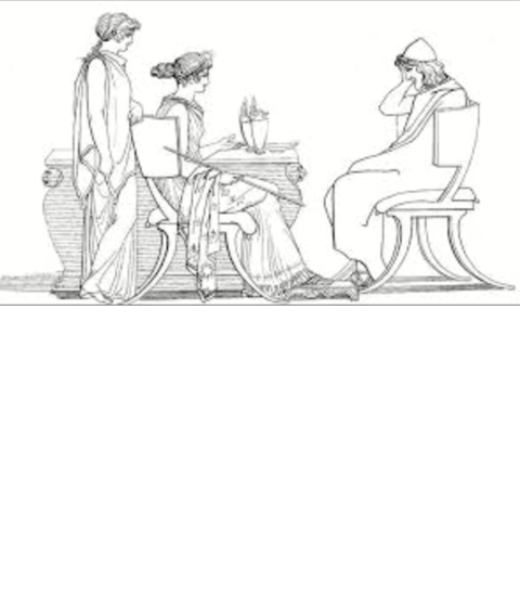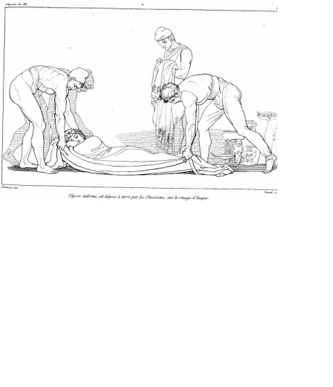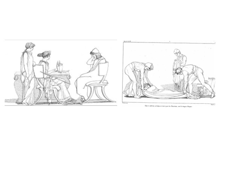 Below right: The queen has her servants prepare a bed for Odysseus. He sleeps on the portico.