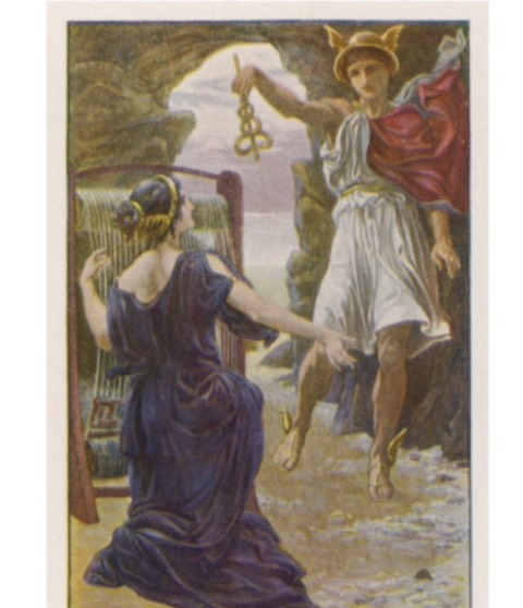 Below left: Hermes tells Calypso of Zeus's order to release Odysseus; she complies.