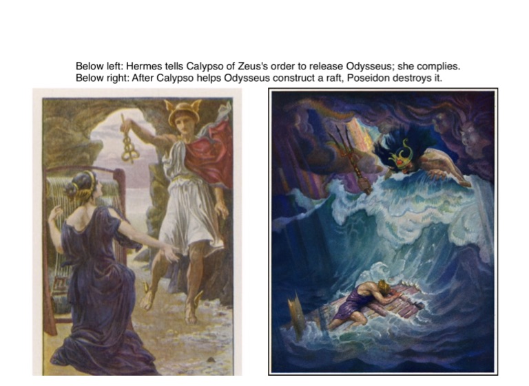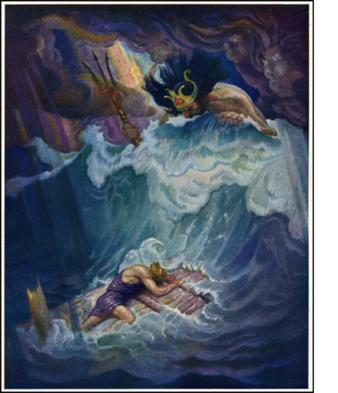 Below right: After Calypso helps Odysseus construct a raft, Poseidon destroys it.