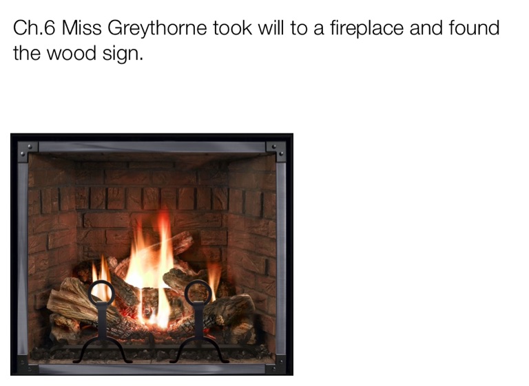 Ch.6 Miss Greythorne took will to a fireplace and found the wood sign.
