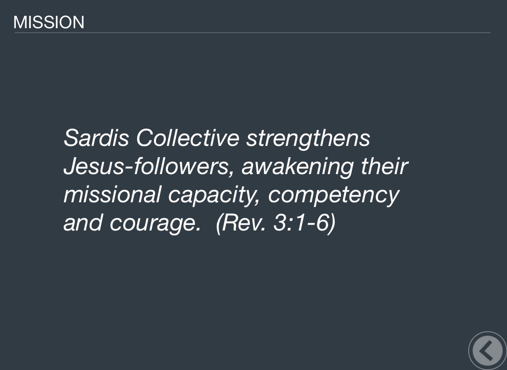 Sardis Collective strengthens Jesus-followers, awakening their missional capacity, competency and courage. (Rev. 3:1-6)