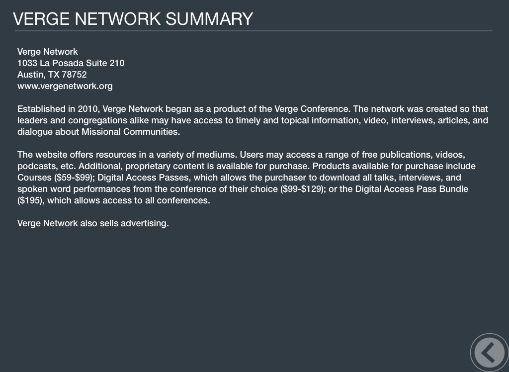 Established in 2010, Verge Network began as a product of the Verge Conference. The network was created so that leaders and congregations alike may have access to timely and topical information, video, interviews, articles, and dialogue about Missional Communities.