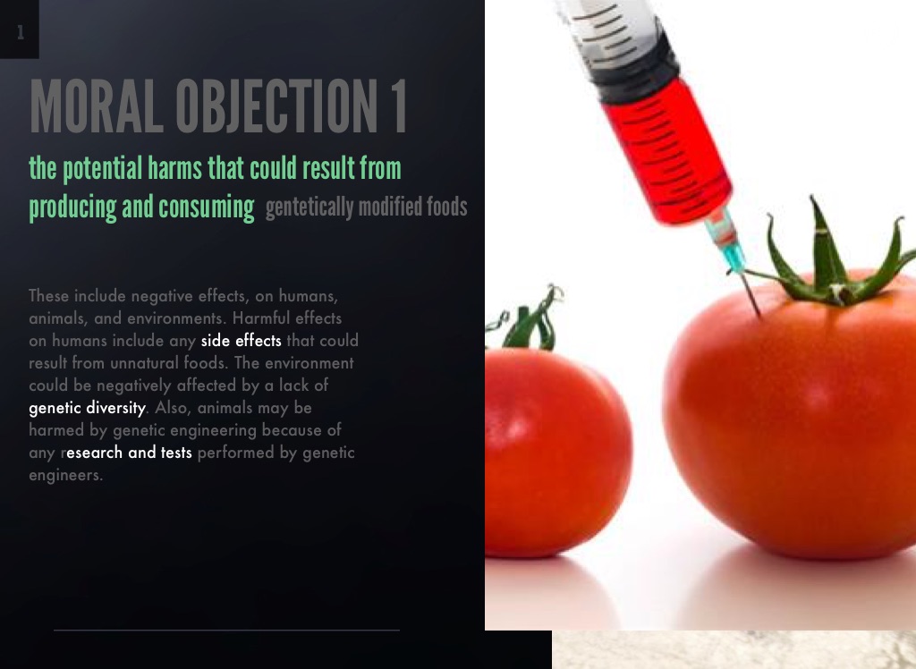 These include negative effects, on humans, animals, and environments. Harmful effects on humans include any side effects that could result from unnatural foods. The environment could be negatively affected by a lack of genetic diversity. Also, animals may be harmed by genetic engineering because of any research and tests performed by genetic engineers.