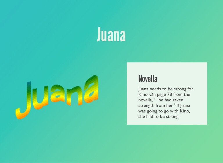 Juana needs to be strong for Kino. On page 78 from the novella, "...he had taken strength from her." If Juana was going to go with Kino, she had to be strong.