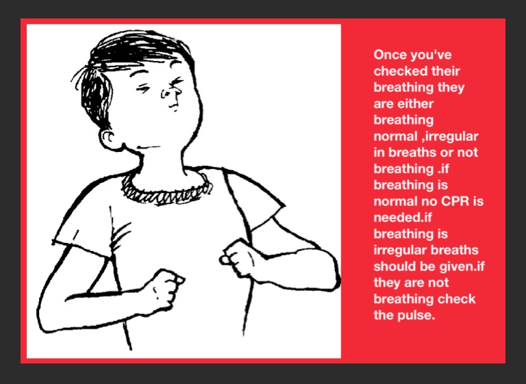 Once you've checked their breathing they are either breathing normal ,irregular in breaths or not breathing .if breathing is normal no CPR is needed.if breathing is irregular breaths should be given.if they are not breathing check the pulse.