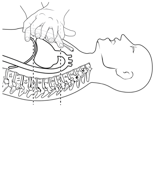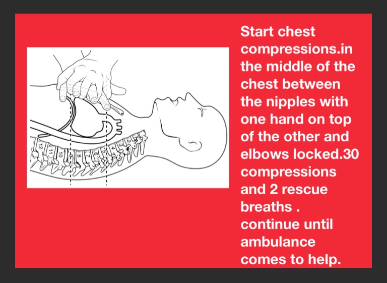 Start chest compressions.in the middle of the chest between the nipples with one hand on top of the other and elbows locked.30 compressions and 2 rescue breaths .
