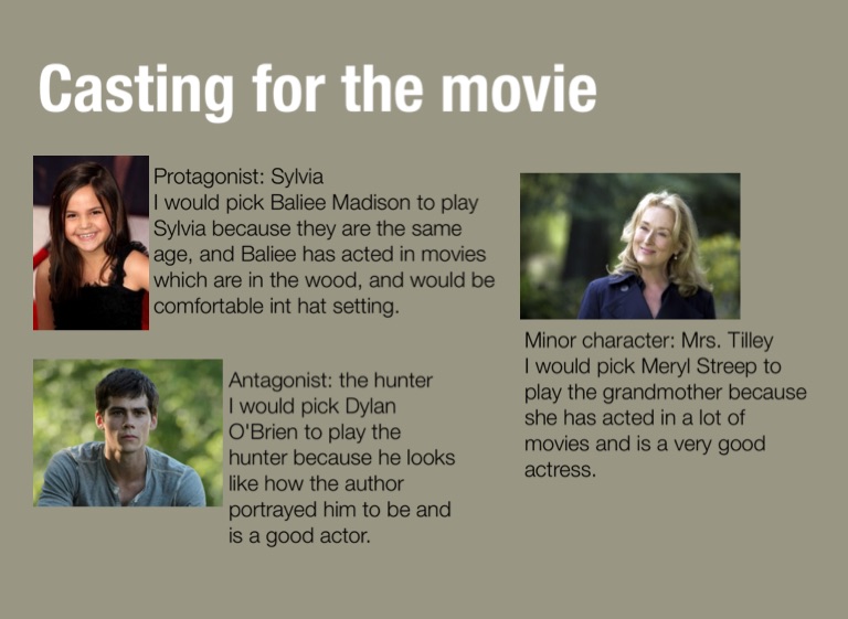I would pick Baliee Madison to play Sylvia because they are the same age, and Baliee has acted in movies which are in the wood, and would be comfortable int hat setting.